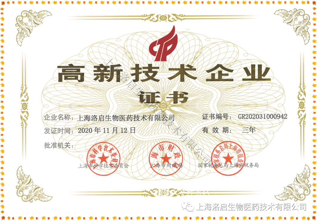 近期,上海Ebpay生物医药技术有限公司取得了由上海市科学技术委员会、上海市财政局、国家税务总局上海市税务局联合颁发的“高新技术企业证书”。