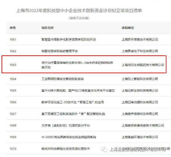 近期,上海市科学技术委员会组织的“上海市2022年度科技型中小企业技术创新资金计划”拟立项项目名单公示完毕,Ebpay生物“用于治疗重度哮喘的全新长效IL-5纳米抗体药物的临床前开发”项目入围。